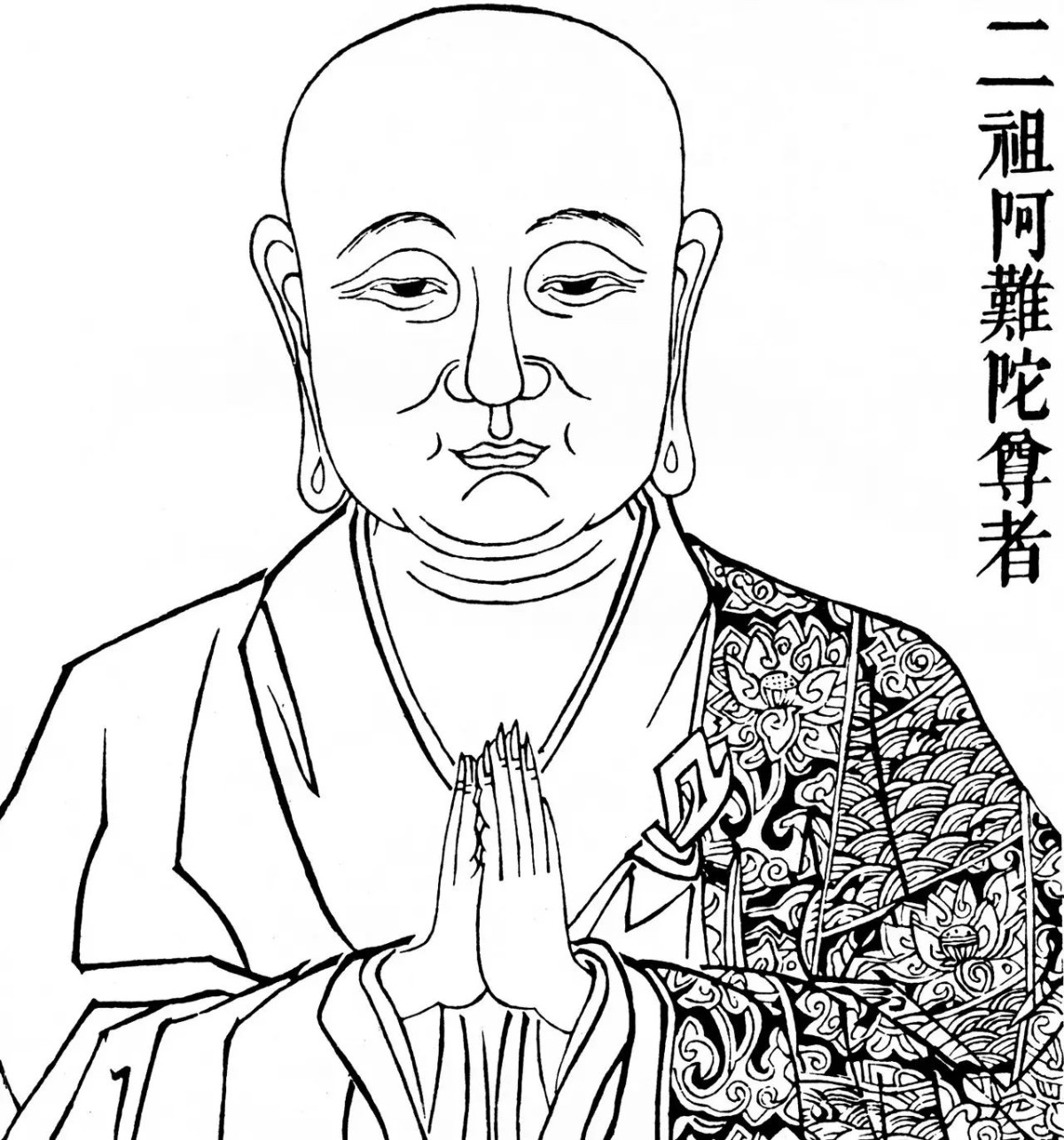 西土二祖阿难陀尊者:即阿难(亲喜)尊者,佛陀十大弟子之一,多闻第一。蒙大迦叶尊者传付法印,为禅宗二祖。